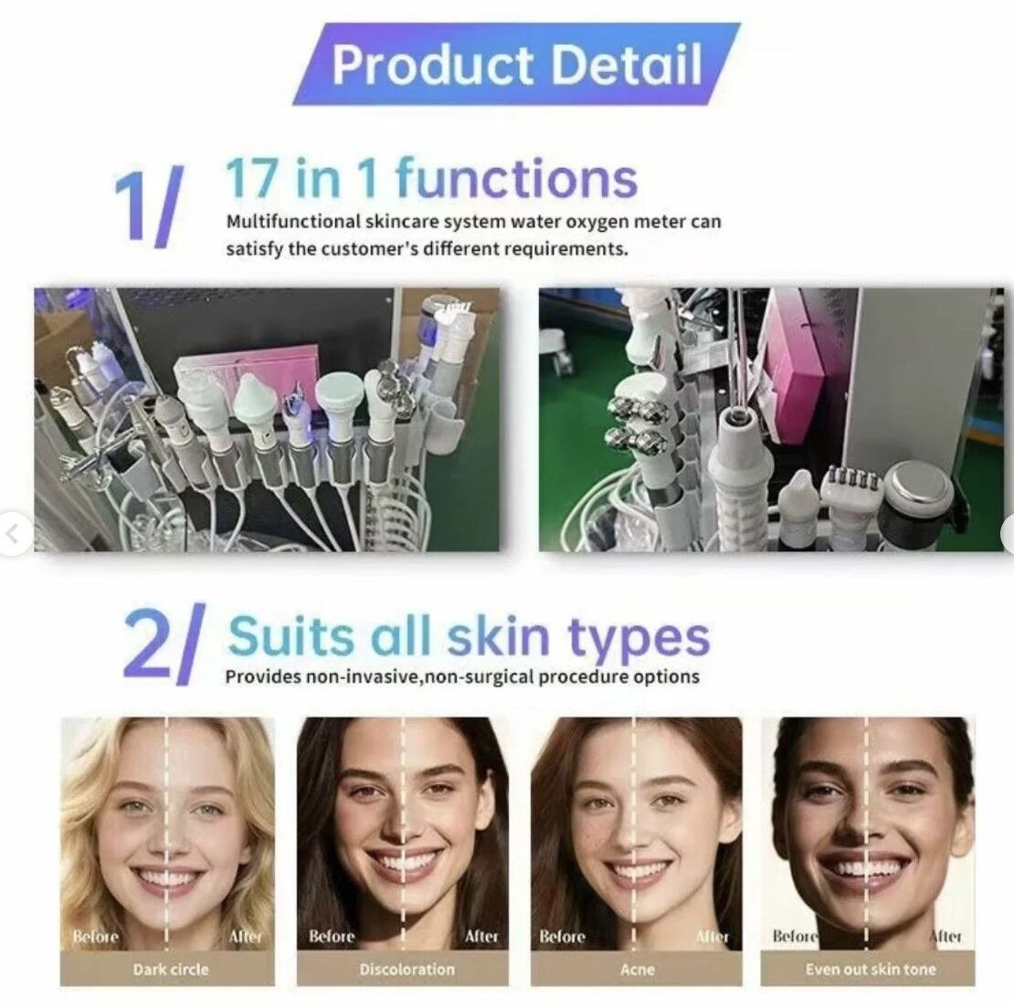 The 17-in-1 Alice Super Bubble HydraFacial Machine is the ultimate solution for comprehensive skin care, offering non-invasive technologies that penetrate deeply into the skin for lasting results. Its multifunctional design makes it suitable for refining texture, evening skin tone, clearing acne, controlling oil, and boosting radiance, providing clients with a glowing, youthful appearance.