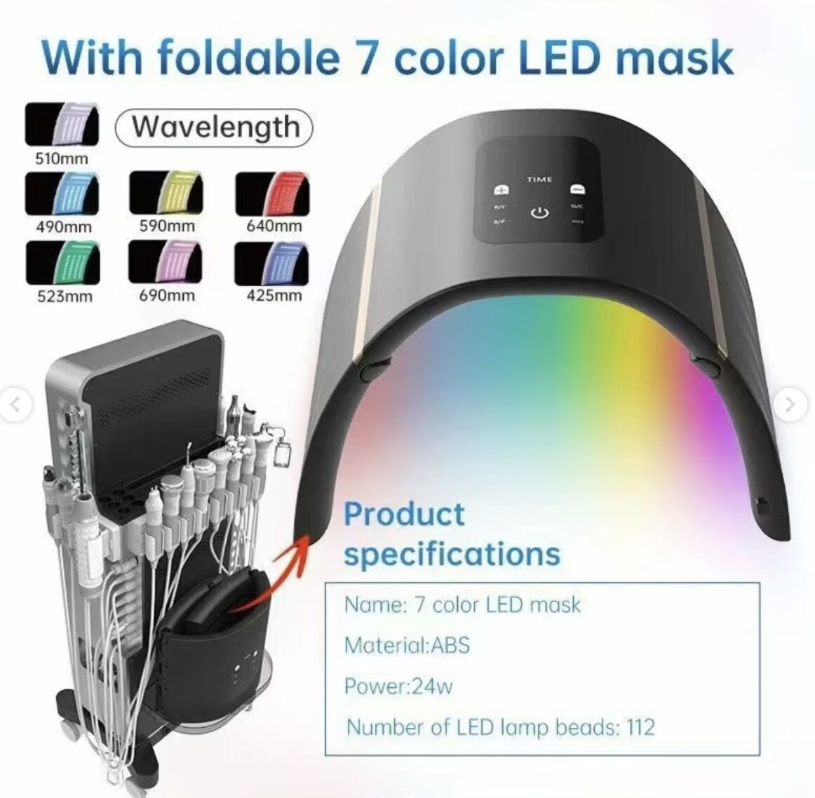 LED Colorful Light Mask: Includes red, blue, and white lights for collagen regeneration, skin soothing, and enhanced tissue metabolism, addressing various skin concerns.